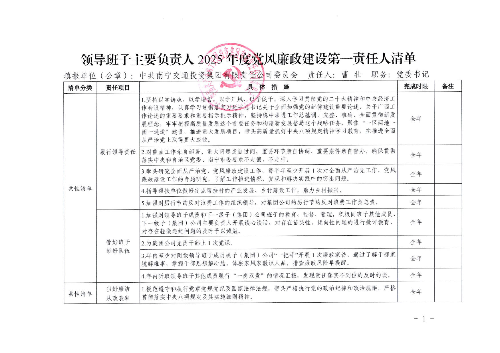 南寧交投集團領(lǐng)導(dǎo)班子其他成員2025年度黨風(fēng)廉政建設(shè)“一崗雙責(zé)”清單(一)