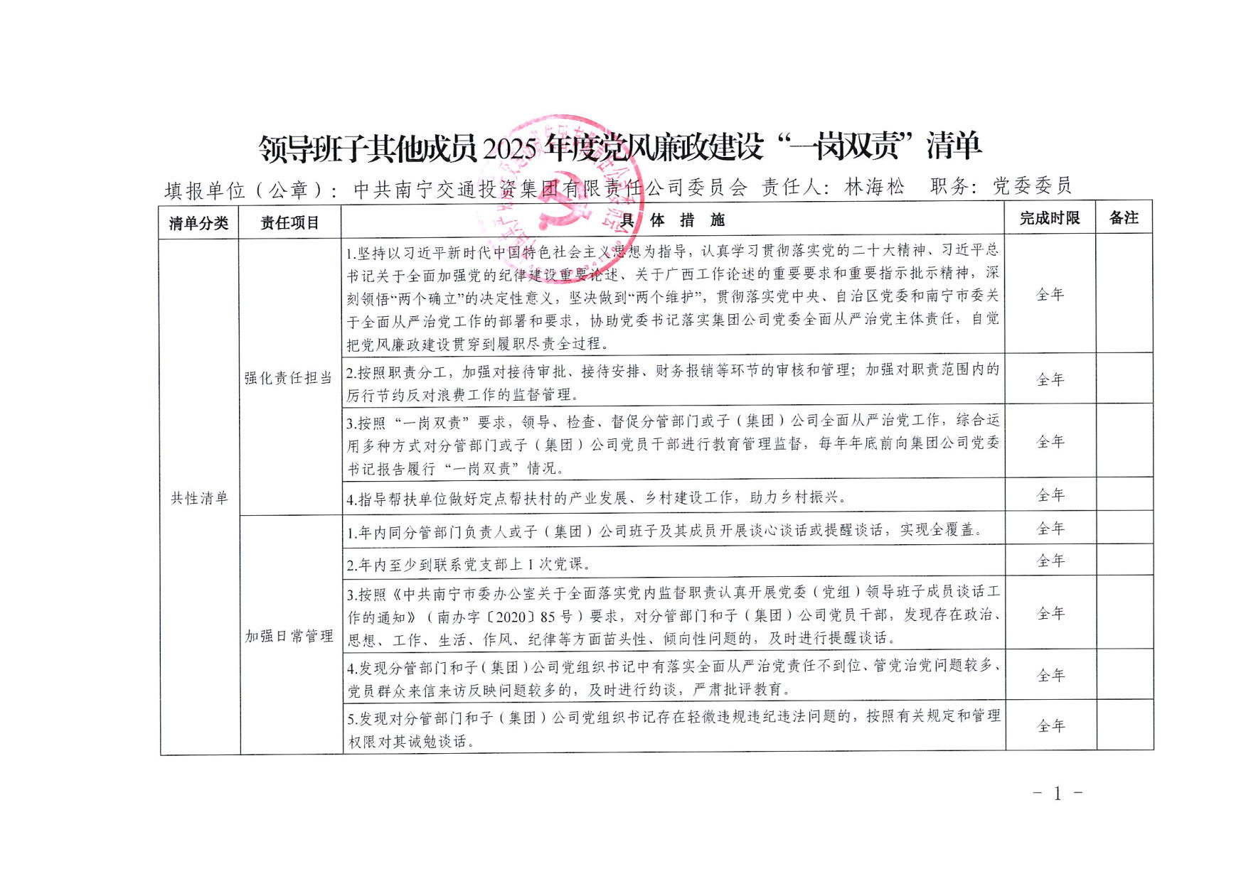 南寧交投集團(tuán)領(lǐng)導(dǎo)班子其他成員2025年度黨風(fēng)廉政建設(shè)“一崗雙責(zé)”清單(四)